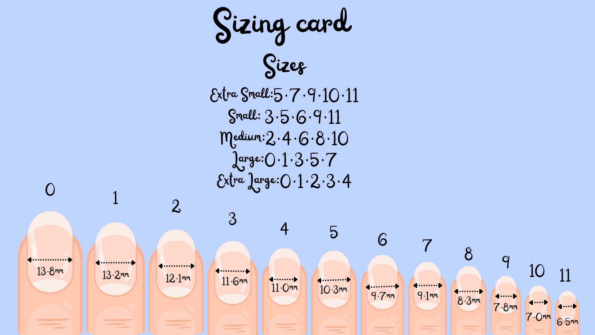 A sizing kit includes every nail size in a shape of your choice to try on and determine your size. Once you know your sizes correspond those with the standard sizes. If none of the standard sizes fit your nail measurements order a custom size.